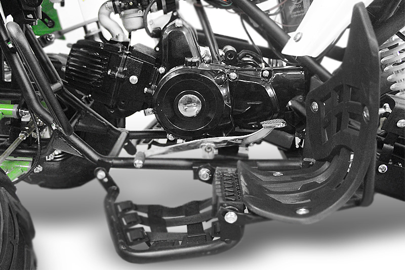 Besonderheiten | Extras: - hydraulische Scheibenbremse hinten - Doppelsportauspuff - Automatik + Rückwärtsgang - Ladegerät, Ladebuchse am Quad - Alarm-Anlage mit 2x Fernbedienung (Starten & Ausschalten via Fernbedienung) - 7" Zoll Reifen - Not-Aus Leine am Heck - Daumengas drosselbar - Kaltstarter am Lenker - Scheinwerfer + Rücklicht
